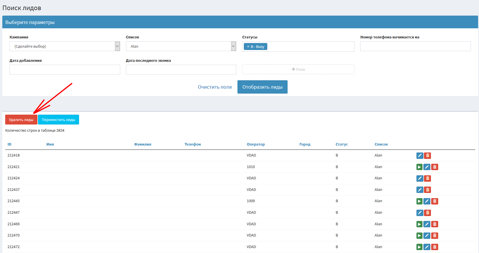 Также лидов, найденных по результатам поиска можно удалить, нажав соответствующую кнопку